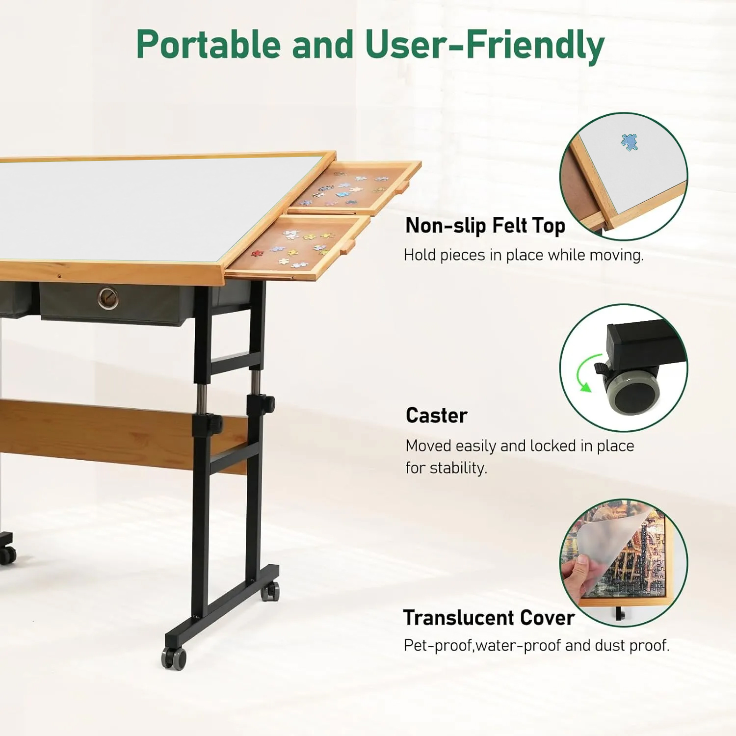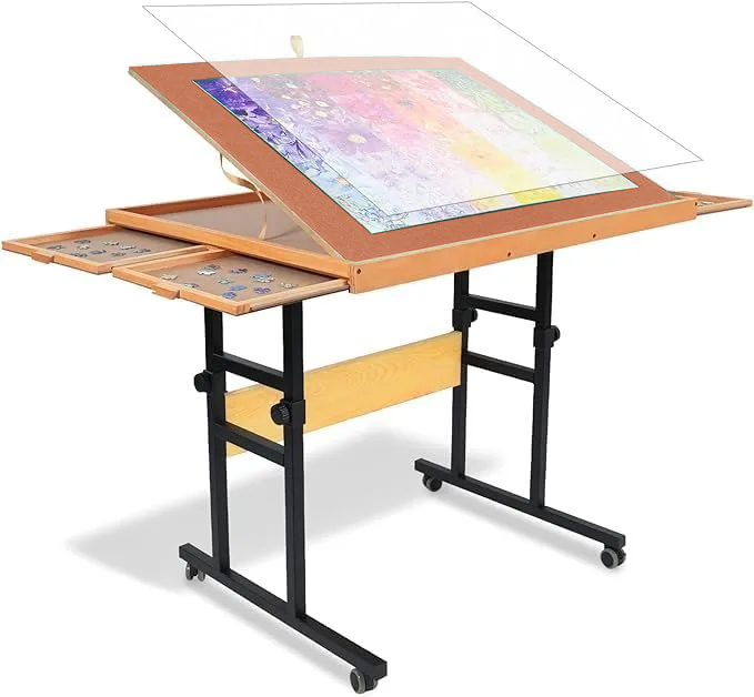 adjustable puzzle table with wheels can remove easily,When you want to move the puzzle table from the living room to the bedside, you only need to unlock the roller and push the puzzle table to move, very easy, and it is not easy to overturn the puzzle,and when you arrive the place,you can lock the roller,and stop the puzzle table from leaving